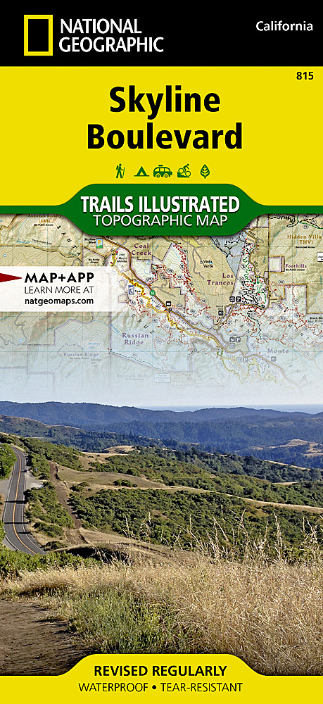Running along the side of the Santa Cruz Mountains, Skyline Boulevard is known for its scenic attractions and unlimited recreational opportunities. Outdoor enthusiasts exploring this California Scenic Byway and surrounding area will find National Geographic's Trails Illustrated map of Skyline Boulevard and indispensable tool. Expertly researched and created in partnership with Midpeninsula Regional Open Space, California State Parks and others, the map covers the Skyline Boulevard area with unparalleled detail, starting from Golden Gate National Recreation Area's Milagra Ridge and Mori Point in the northwest to Sanborn-Skyline Park and Castle Rock State Park in the southeast. Coverage includes tens of state and county parks and beaches, open space preserves (MROSD) and other public recreation areas; miles of California shoreline, including Half Moon Bay State Beach and Monterey Bay National Marine Sanctuary; South San Francisco and San Mateo; and the Santa Cruz Mountains.